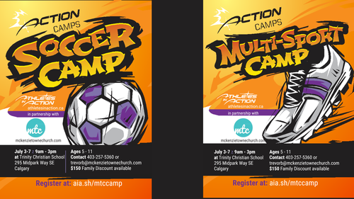Each camp has trained coaches to help kids build relationships, develop their skills with sports, and will have "God Moments" where each camper meets with a small group throughout the day. Each camper will receive a T-Shirt at the end. We will have access to a gym, washrooms, a sports field, and should be able to run rain or shine!